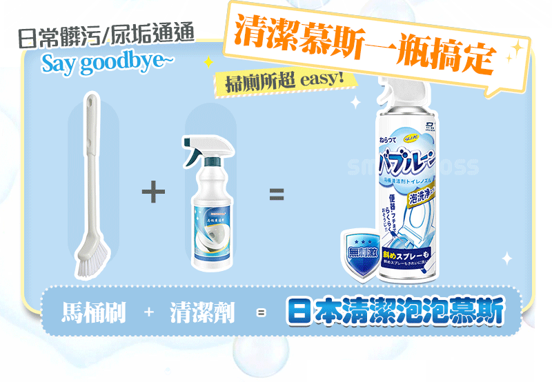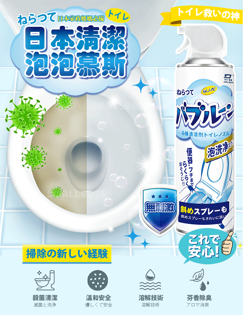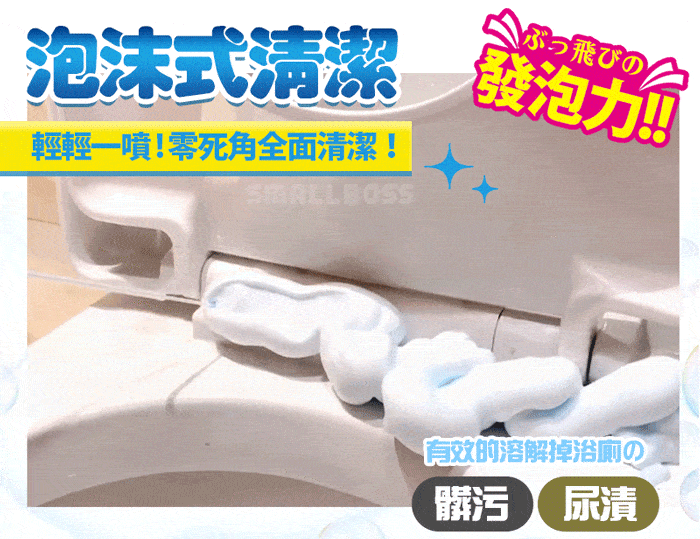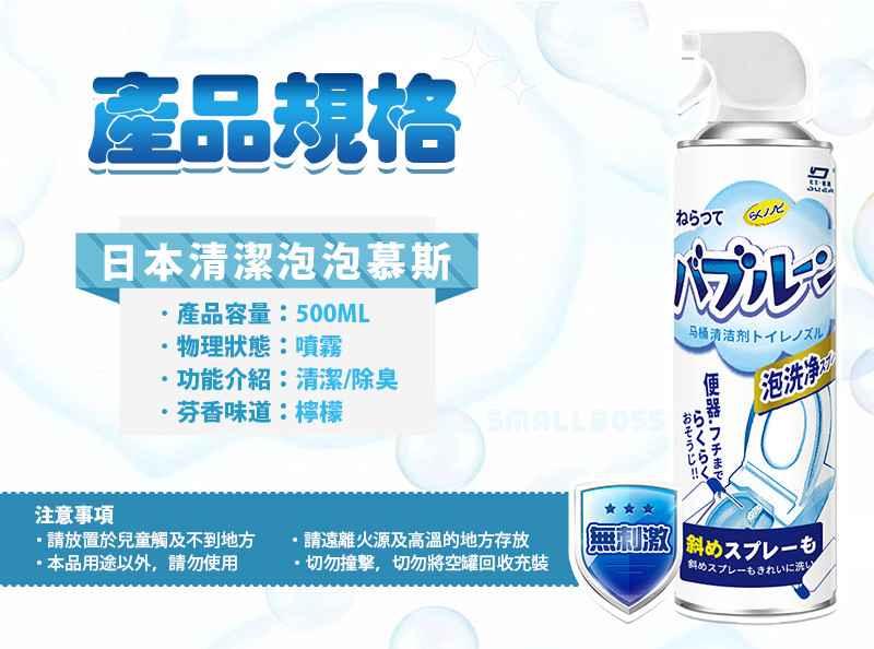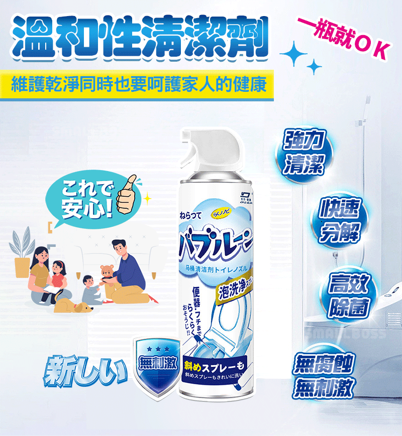 日本潔淨泡泡慕斯馬桶清潔劑天然不刺激配方的免刷式清潔用品,不殘留不須水洗,溫和性清潔劑具有强力清潔去汙、除異味、殺菌除菌效果。馬桶清潔泡泡慕斯免刷式清潔劑,輕輕一噴污漬迅速溶解,馬桶污漬清潔粉,無須刷洗,有效防止細菌滋生產品成分溫和不刺激。